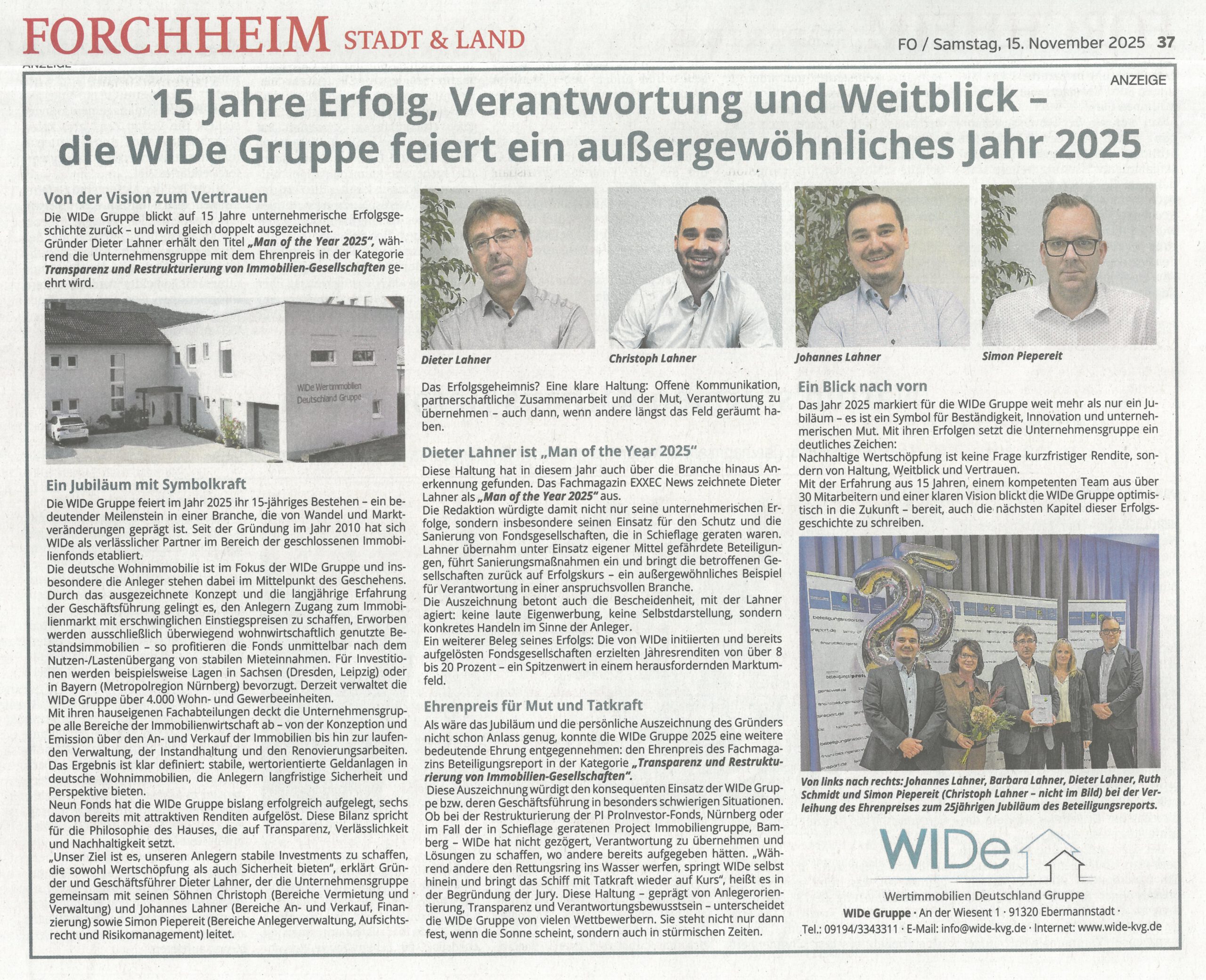 Gewinner des deutschen Beteiligungspreises 2025: WIDe Wertimmobilien Deutschland Fondsmanagement GmbH – Ein Unternehmen der WIDe Gruppe Ebermannstadt, 09.10.2025 Die WIDe Wertimmobilien Deutschland Fondsmanagement GmbH wurde am 9. Oktober 2025 erneut mit dem Deutschen BeteiligungsPreis ausgezeichnet. WIDe erhielt den Ehrenpreis in der Kategorie „Transparenz und Restrukturierung von Immobilien-Gesellschaften“. Die Stiftung Finanzbildung verleiht den BeteiligungsPreis jährlich an